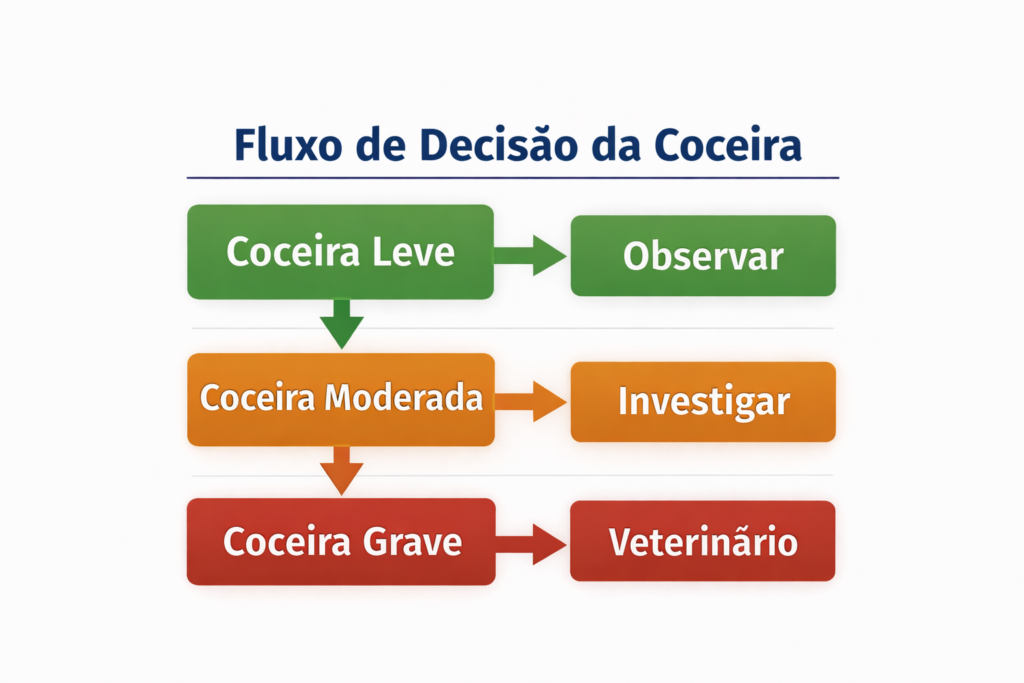 A coceira moderada é o ponto mais perigoso do ponto de vista decisório, porque muitos tutores tentam resolver sozinhos, mas o risco de erro já é alto.