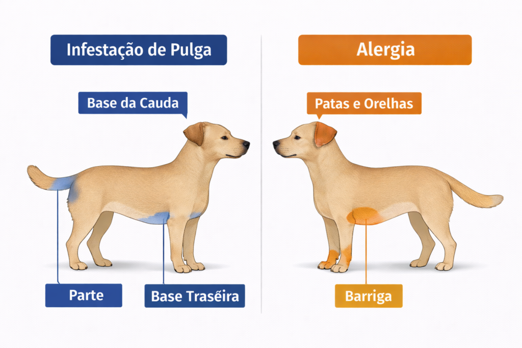 A ausência de pulga visível não exclui alergia, infecção, sarna ou outros problemas. Muitos quadros alérgicos começam sem qualquer sinal aparente na pele, apenas com coceira persistente.